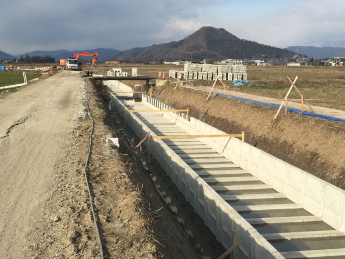 農業用水や排水機能の向上を目的とした用水路設置工事を行っています。自然水路では浸食や崩壊のリスクが高く、水流の安定確保が課題でしたが、当社は安全で耐久性のある水路整備で地域の水利環境改善に貢献しています。
